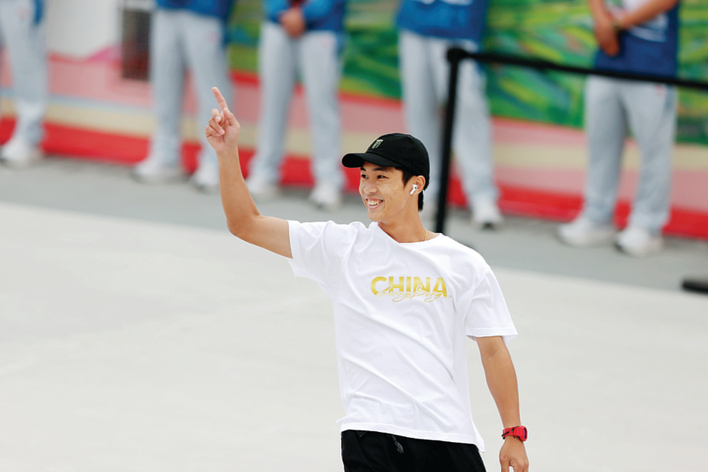作为赛场上的“老将”,潘家杰在比赛中以“稳”为主,两轮比赛下来,排名暂居第二。然而,在动作展示环节,他第一个动作就出现失误。好在这位经验丰富的选手迅速调整状态、火力全开,凭借精准的平衡感和出色的爆发力,连贯完成空中转体、滑板飞跃等一系列高难度动作,最后以领先对手24.46分的优势夺冠。